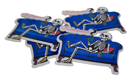 Luuranko löhnää sohvalla ja ryystää kahvia